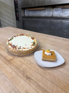 We have our cakes, cheesecakes, and pies available for online ordering. We will have online payment in the near future. In the meantime, you can pay with cash/credit/debit cards in-bakery or give us a call to expedite pickup.