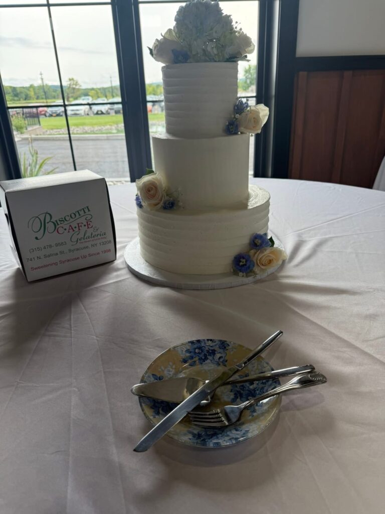 Three Tiered Wedding Cake Horizontal Spatula White Blue Flower Clusters WC172