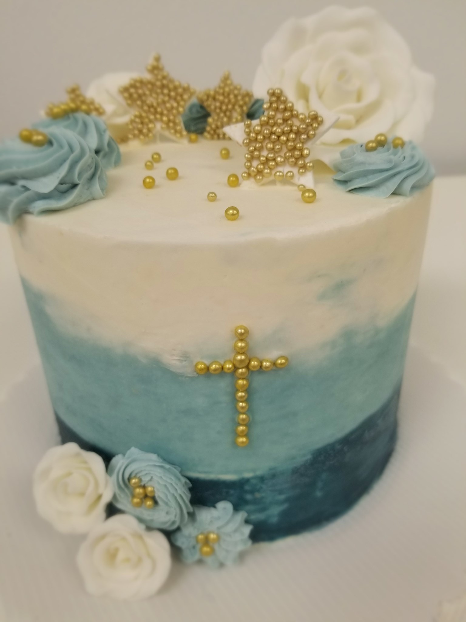 Double Stacked Baptism Cake Gold Cross Buttercream Roses SC412