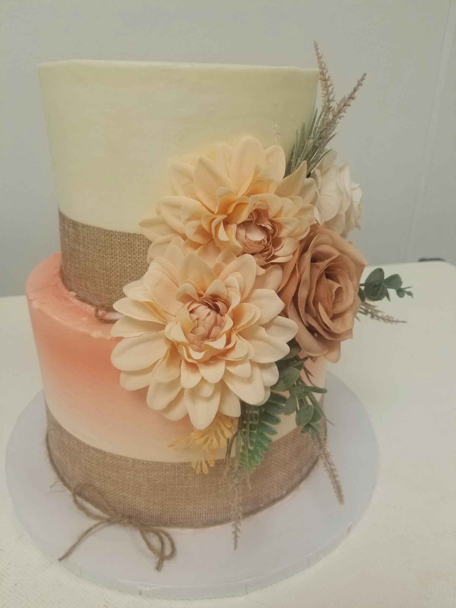 Two Tiered Wedding Cake Diagonal Spatula Burlap Ribbon Sunflowers WC165