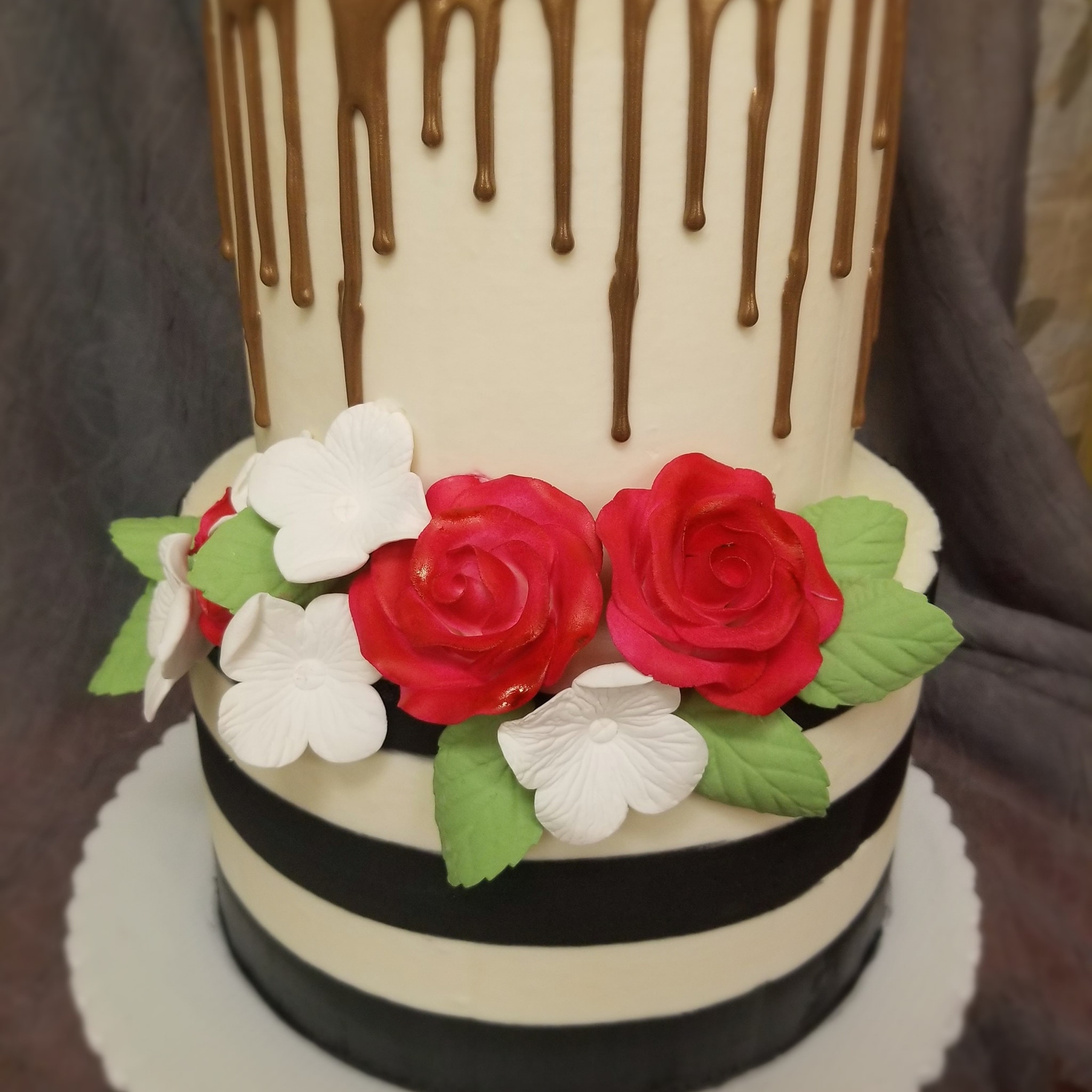 Three Tiered Wedding Cake Naked Gold Drip Flower Clusters WC057