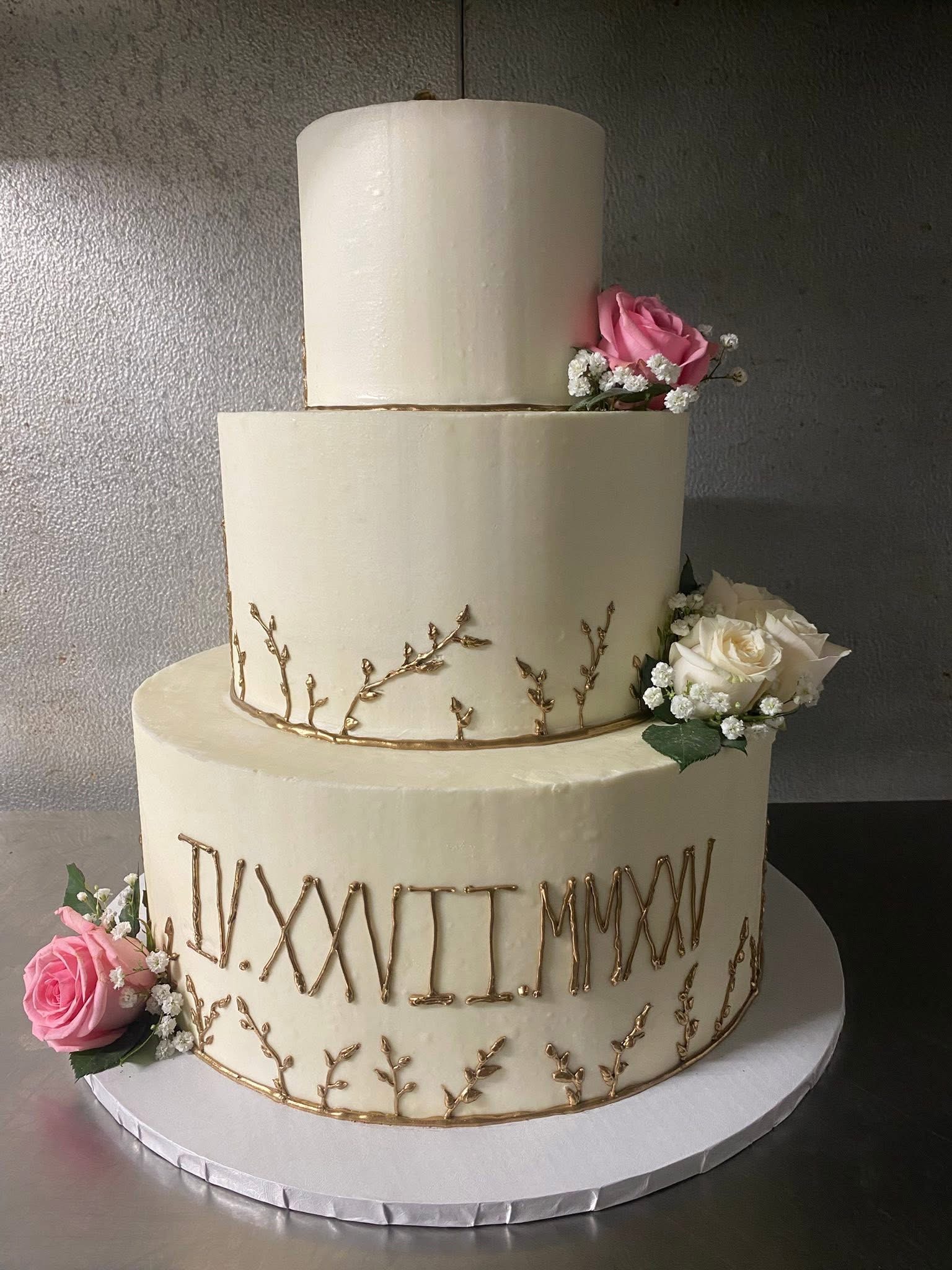 Three Tiered Wedding Cake Gold Piping Rose Clusters WC056