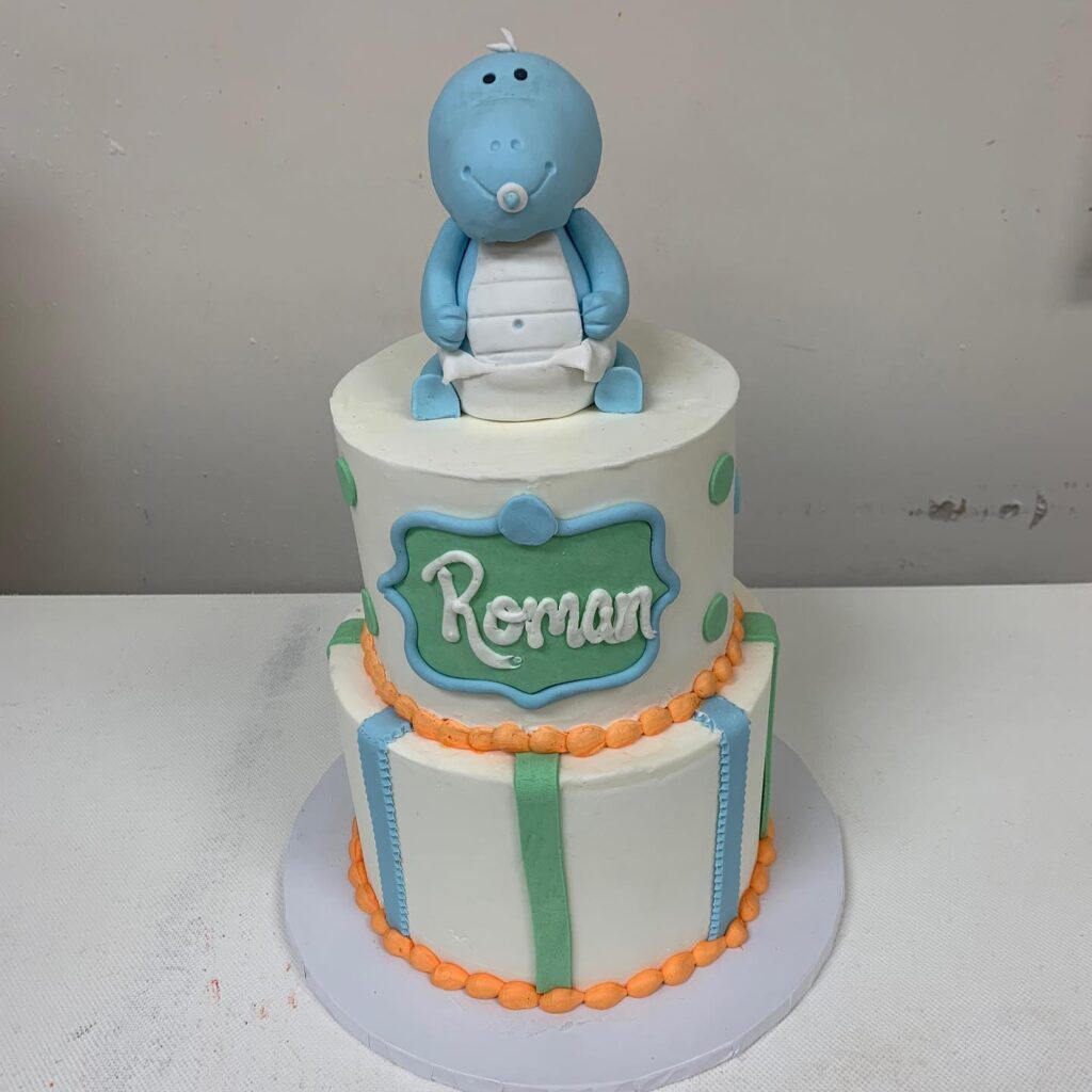 Two Tiered Baby Shower Cake Stripes Dinosaur SC172