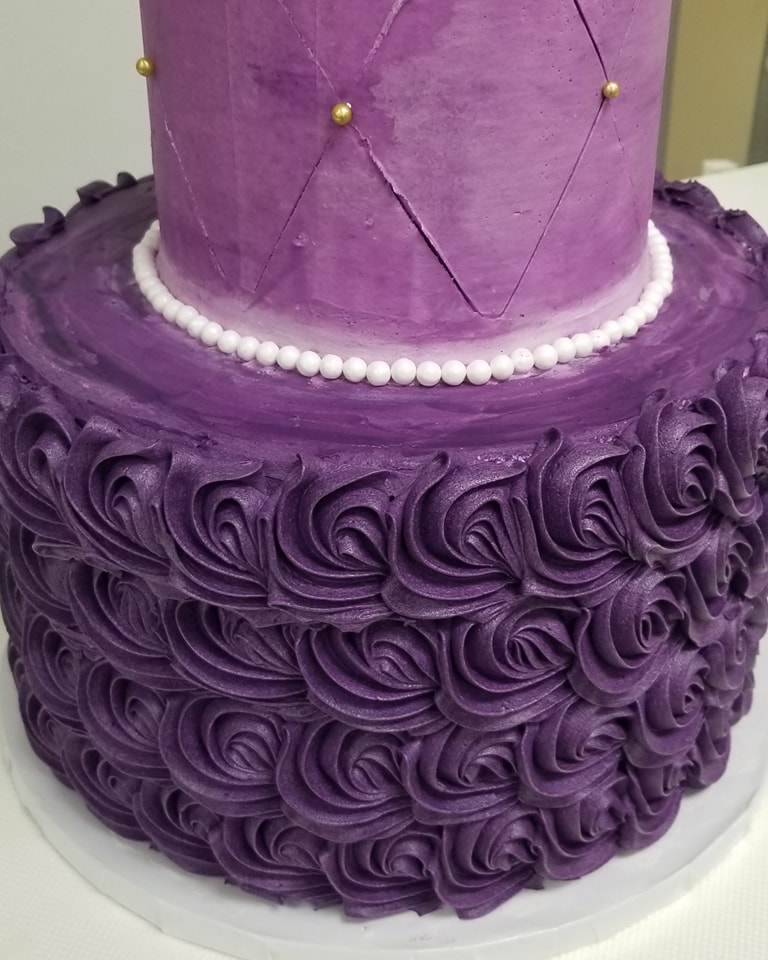 Three Tiered Quinceanera Cake Tangled Gold Purple Fondant Covered Flowers SC380